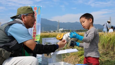 ニュース&トピックス親子14組が秋の田んぼの生きもの調査