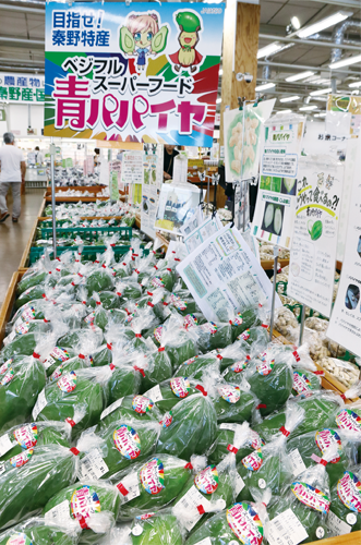 現在、同年に設立した「JAはだの青パパイヤ研究会」に所属する15人の生産者を中心に約60aで栽培しています。9月からJAはだの農産物直売所「はだのじばさんず」などへの出荷が始まり、11月下旬まで続く予定です。