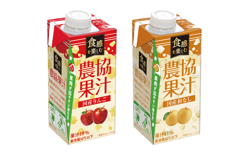 全農と協同乳業(株)は国産果実を使用した農協果汁の新シリーズとして、果肉の食感が楽しめる果汁飲料「食感を楽しむ農協果汁 国産りんご、国産和なし」を10月6日から全国の量販店で発売しています。