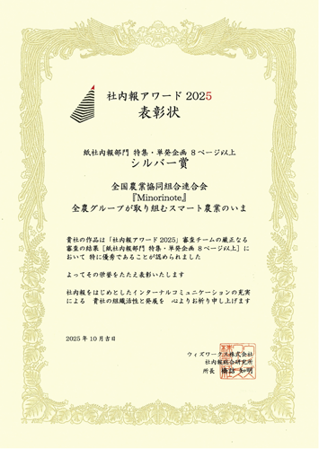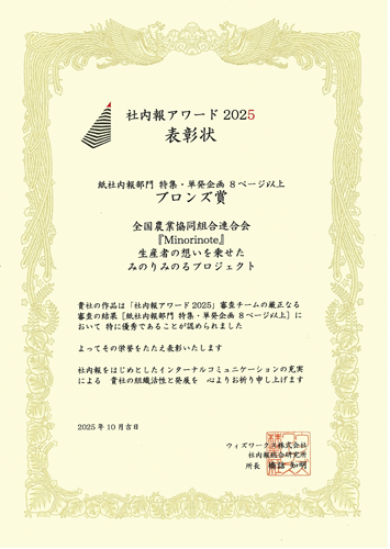 全農広報・調査部が発行する全農グループ広報誌『Minorinote(みのりのおと)』が、社内報アワード2025のシルバー賞とブロンズ賞を受賞しました。