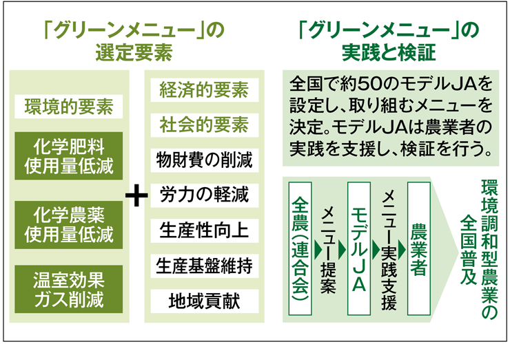 地球温暖化への対応としては、環境調和型農業の技術・資材を体系化した「グリーンメニュー」を策定し、実行しています。2030年度には全てのJAにおいて「グリーンメニュー」に取り組んでいただけることを目標に取り組んでいます。