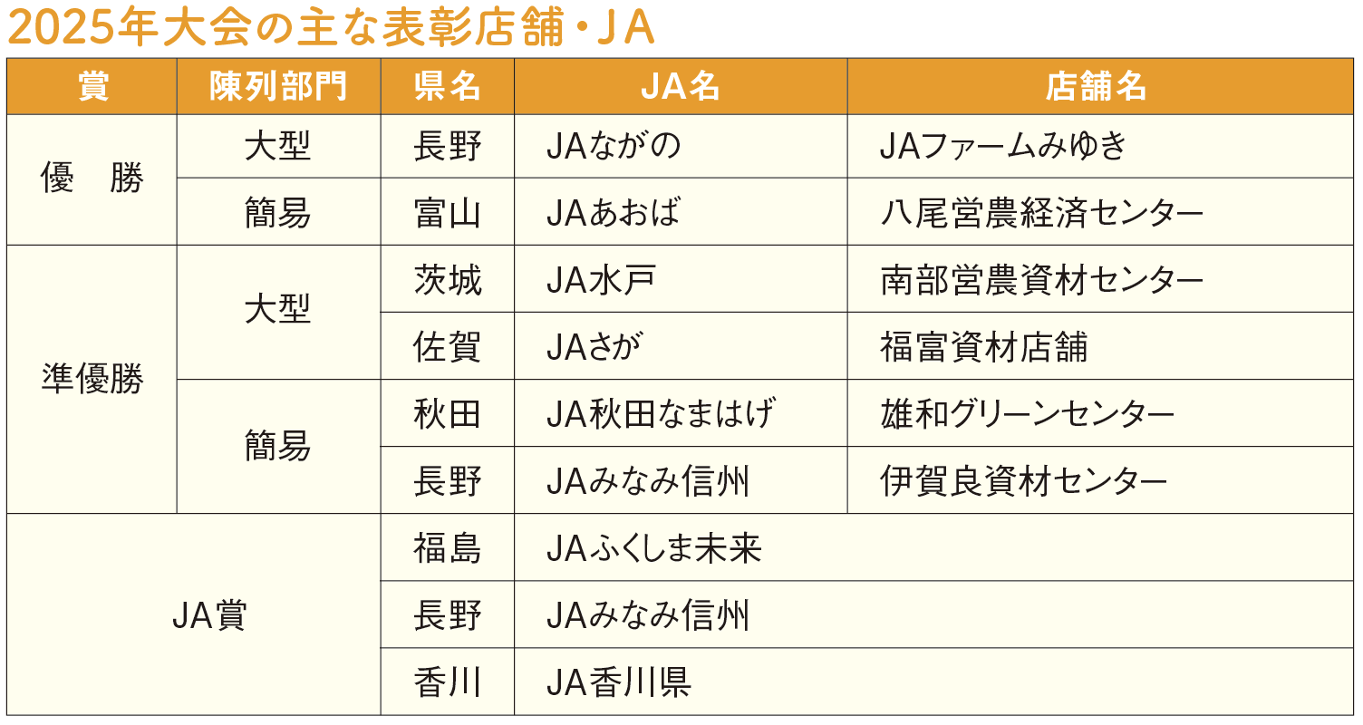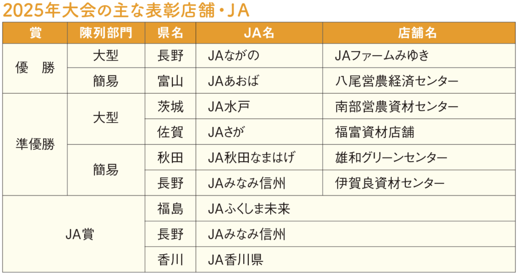 JA賞を受賞したJAふくしま未来(福島県)、JAみなみ信州(長野県)、JA香川県は、魅力ある店舗づくりに向けた店舗コンクールや陳列コンテスト、各種スキルアップ研修会など独自の取り組みを紹介しました。