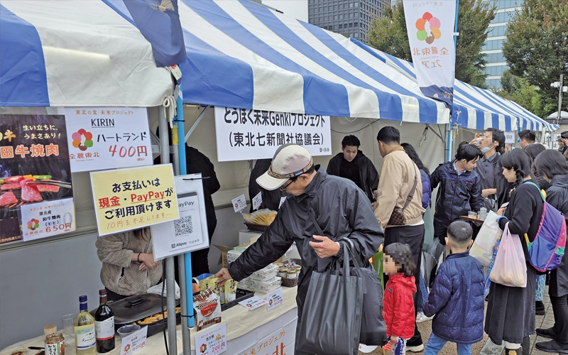今回、全農東北プロジェクトは、東北七新聞社協議会が企画する「とうほく未来 Genki プロジェクト」と連携してブース出店しました。2日間ともにあいにくの天候でしたが、各県メンバーが積極的に東北産農畜産物をPR。来場者からは「東北産の和牛は柔らかくておいしい」「東北を訪れて、ぜひ現地で食べたい」との声が聞かれ、東北の魅力を伝えることができました。
