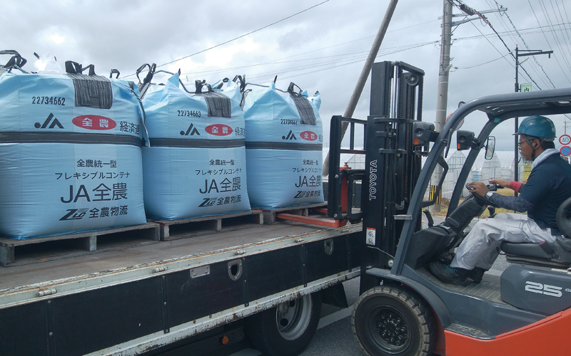 労働力が確保できない担い手には無料での庭先集荷を実施しています。また、全農統一フレコン・全農パレチゼーションを導入することで、組合員・JAともに重労働となる手荷役を回避でき、庭先集荷時間の短縮、検査入庫・出庫場面でJA職員の作業時間、労力の大幅削減を実現しました。