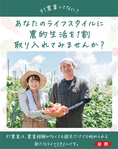 91農業は、「あなたのライフスタイルに農的生活を1割取り入れませんか?」をコンセプトとし、農業参加へのハードルを下げることで、週末や空いた時間に、働き手を求める農家と農業に関心を持つ人をつなぐ取り組みです。