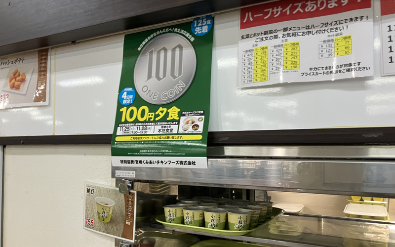 全農チキンフーズグループの宮崎くみあいチキンフーズは11月25~28日、宮崎大学の学生を対象に、大学生協が国産鶏肉を使用したメニューを100円で提供する「100円夕食」企画に協賛しました。