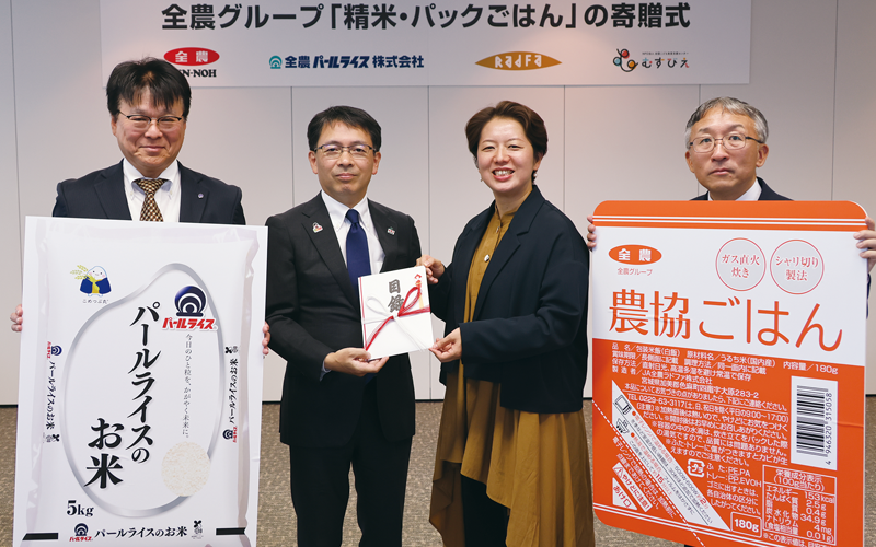 全農は、東京・大手町のJAビルで11月21日に寄贈式を行い、金森正幸常務理事が、むすびえの遠藤典子理事に目録を贈りました。むすびえを通じて関東(埼玉、千葉、東京、神奈川)、関西(大阪、兵庫)各エリアのこども食堂へ精米5kg6000袋、パックご飯7万2000食が提供されます。