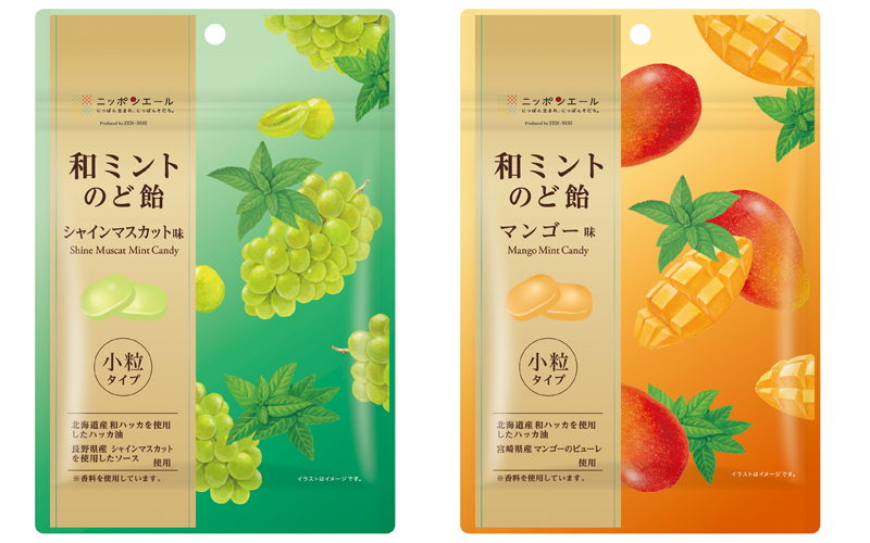 ニッポンエール「和ミントのど飴」2品は、北海道産和ハッカのハッカ油を使用したのど飴です。国産果実の中でも人気の高い長野県産「シャインマスカット」のソースと、宮崎県産「マンゴー」のピューレをそれぞれ使用しています。和ハッカの爽やかな香りと国産果実の豊かな甘みをお楽しみください。
