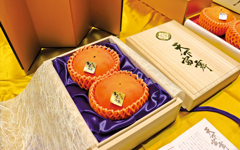 名前は織田信長公の「天下布武」にちなみ、この柿を手に取った全ての方々に「富が舞い込む」ことを願って命名。厳重管理で生産され、国内外で高い人気を誇ります。