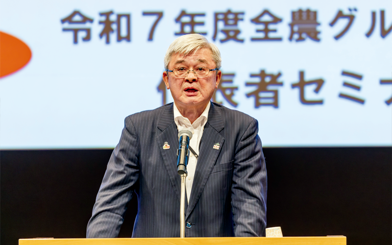 セミナーの開会に当たり、折原敬一経営管理委員会会長は冒頭のあいさつで、令和の米騒動に際し、全農グループが発揮した総合力に触れ、「事業環境が大きく変化する中で全農グループ全体のシナジーを高め、これまで以上に総合力を発揮していくことが重要。そのためにグループ経営の強化に取り組むとともに、将来への投資を惜しまず、人材育成に注力し、活力ある全農グループの未来を創っていく」と述べました。
