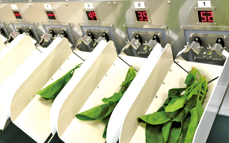 新センターでは、根や下葉の除去から袋詰めまでを機械化。ホウレンソウはベルトコンベヤーで流れ、最新の調製機や自動計量器、自動包装機により手作業の工程を大幅に省力化しました。特に県内初の10連自動計量器を2台導入し作業効率を高めています。4〜12月には外部労働力を活用し、1日約1800kgを処理予定です。