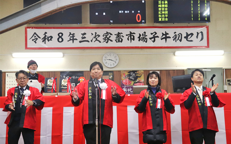 広島県本部は1月下旬、三次市の三次家畜市場で2026年の子牛市場初せりを開催しました。市場には、広島県の横田美香知事が初来場し、生産者を激励しました。