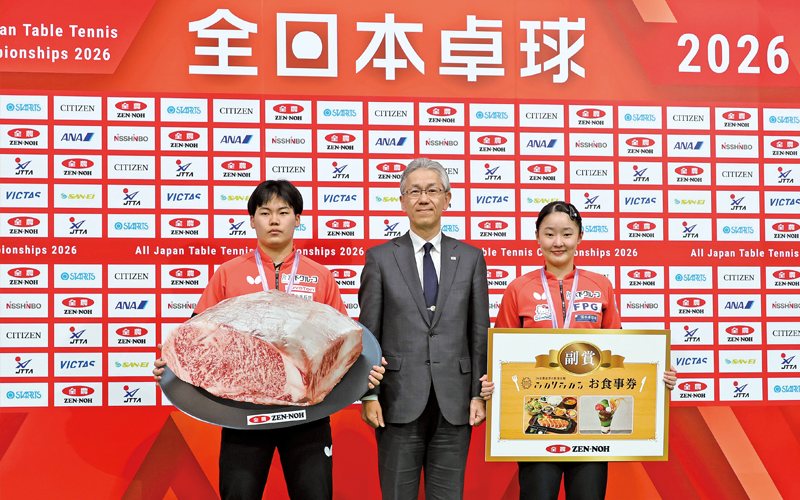 全農は1月20〜25日に東京都渋谷区で開催された卓球の日本一を決める「2026年全日本卓球選手権大会(一般・ジュニアの部)」に協賛しました。優勝選手に副賞を贈呈したほか、会場で国産農畜産物の魅力を知ってもらう抽選会などを行いました。
