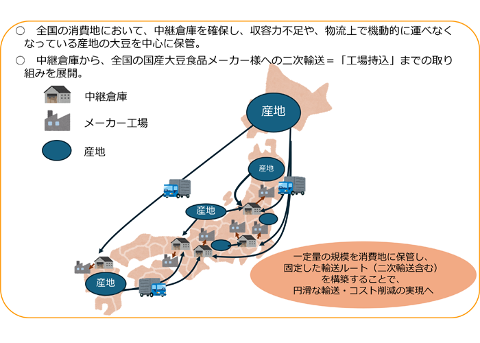 国産大豆は収穫後、生産量の多くを産地倉庫で保管し、メーカー・実需者が産地倉庫まで引き取りに行く流通構造となっていますが、米・麦・大豆を扱う産地では倉庫収容力がひっ迫しており、喫緊の課題となっています。