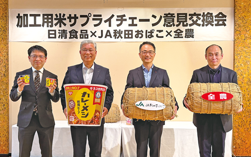 (左から)全農・金森常務理事、JA秋田おばこ・齊藤代表理事組合長、日清食品㈱・深井常務取締役、日清食品ホールディングス㈱・舟根CSCO
