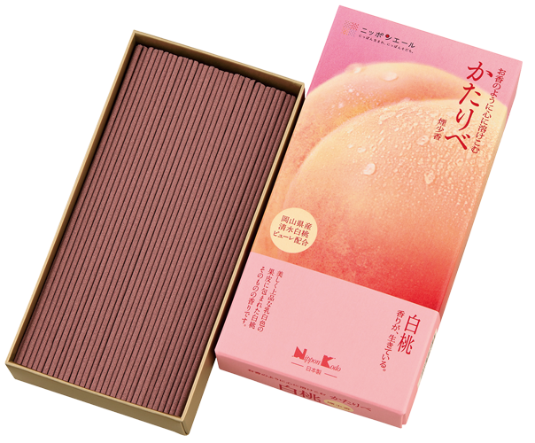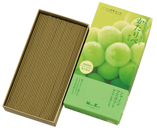 花々の豊かな香りで親しまれてきた㈱日本香堂のお線香「かたりべ」シリーズに、果実の香りとして長野県産「シャインマスカット」と岡山県産「清水白桃」を使用した新商品が登場!