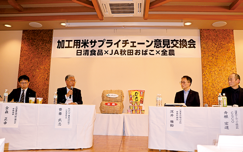 全農は3月、JA秋田おばこ、加工用米の実需者である日清食品㈱と産地・事業者双方にとって持続可能となる事業展開に向け、意見交換会を開催しました。産地・メーカー・流通といった各立場から現状や今後の展望について意見を交わし、将来に向けて有意義な場となりました。